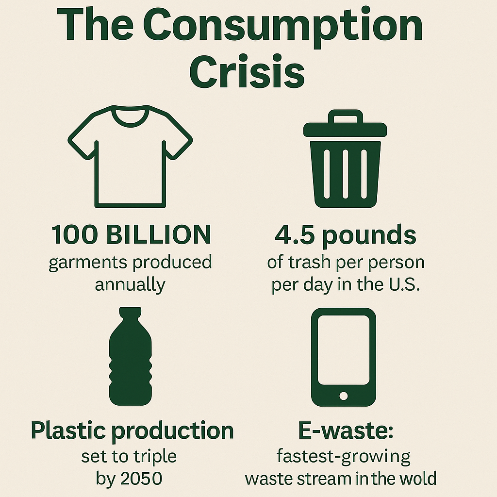 Look around and it’s obvious: consumption has gone off the rails. Fast fashion churns out more than 100 billion garments every year while millions of tons of clothing end up in landfills. Each American throws away about four and a half pounds of trash daily. Plastic production is set to triple by 2050, even as our oceans are already overwhelmed with bottles, bags, and straws. Electronics pile up as e-waste becomes the fastest-growing waste stream in the world.